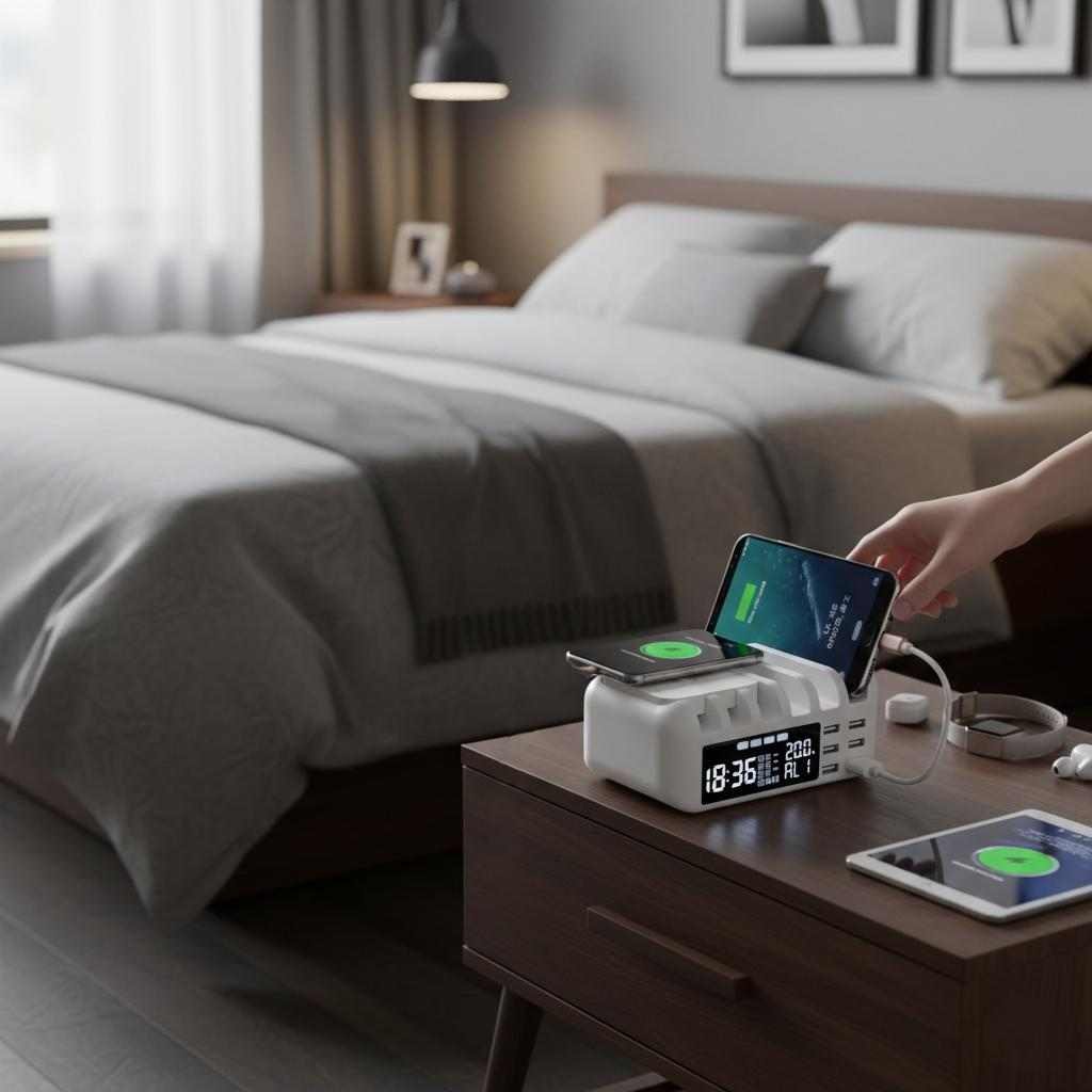 Elevate your bedside or workspace with this all-in-one charging powerhouse. Combining a high-speed wireless charging pad, five USB ports (including QC 3.0), and a sleek digital alarm clock, the ZH-06 keeps your devices powered and your schedule on track with minimalist elegance.